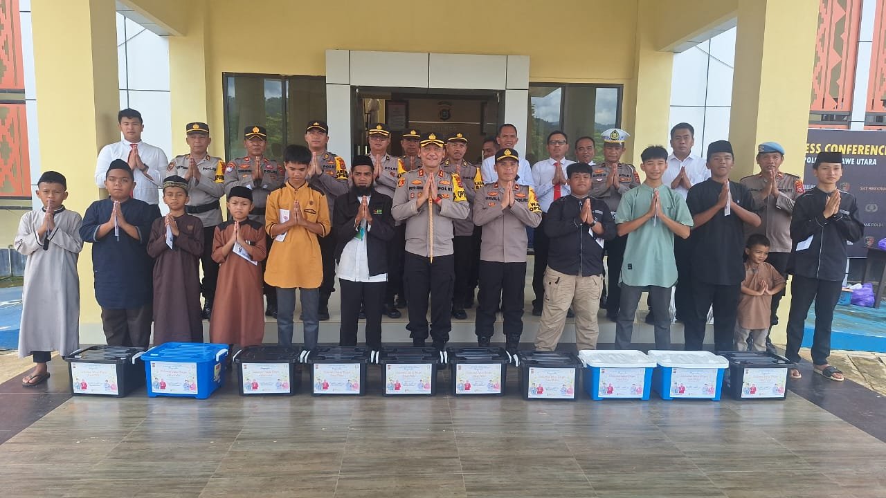 Dipimpin Ustadnya para santri menerima bingkisan yang di serahkan langsung Kapolres Konawe utara AKBP Priyo Utomo bersama Pejabat Utama Polres Konut