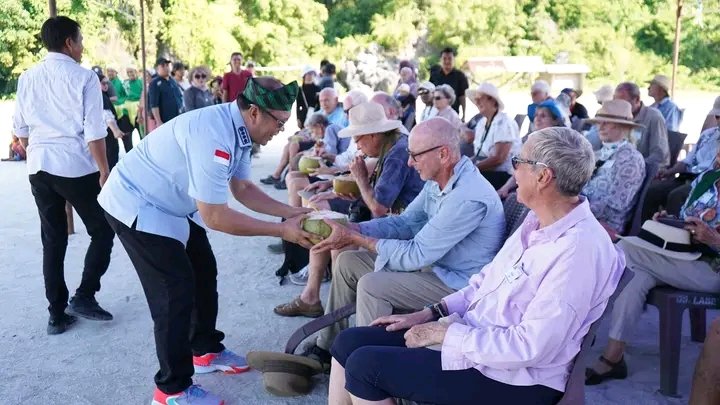 Bupati Konut Sambut Kedatangan Kapal Pesiar MV Coral Adventurer Membawa Wisatawan Manca Negara Di Pulau Labengki.