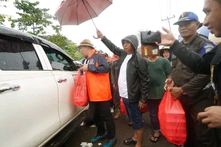 Tidak hanya meninjau, Bupati juga berbagi kebaikan dengan membagikan makanan kepada para pengguna jalan yang terjebak antrian akibat banjir.