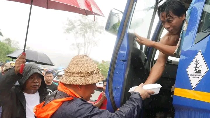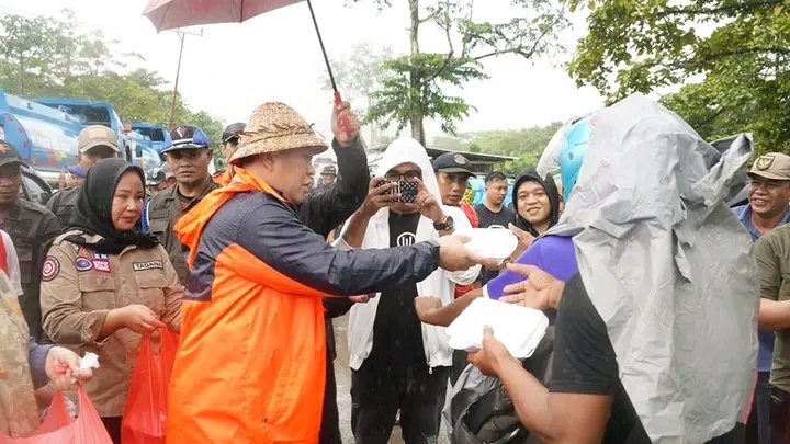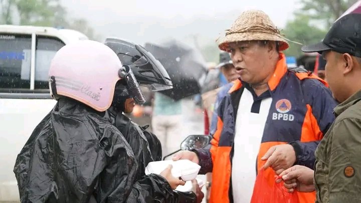 Bupati Konut Membagikan Sejumlah Kotak Nasih Baik Pengendara Yang Melintas Maupun Masyarakat Yang Terdampak Banjir.