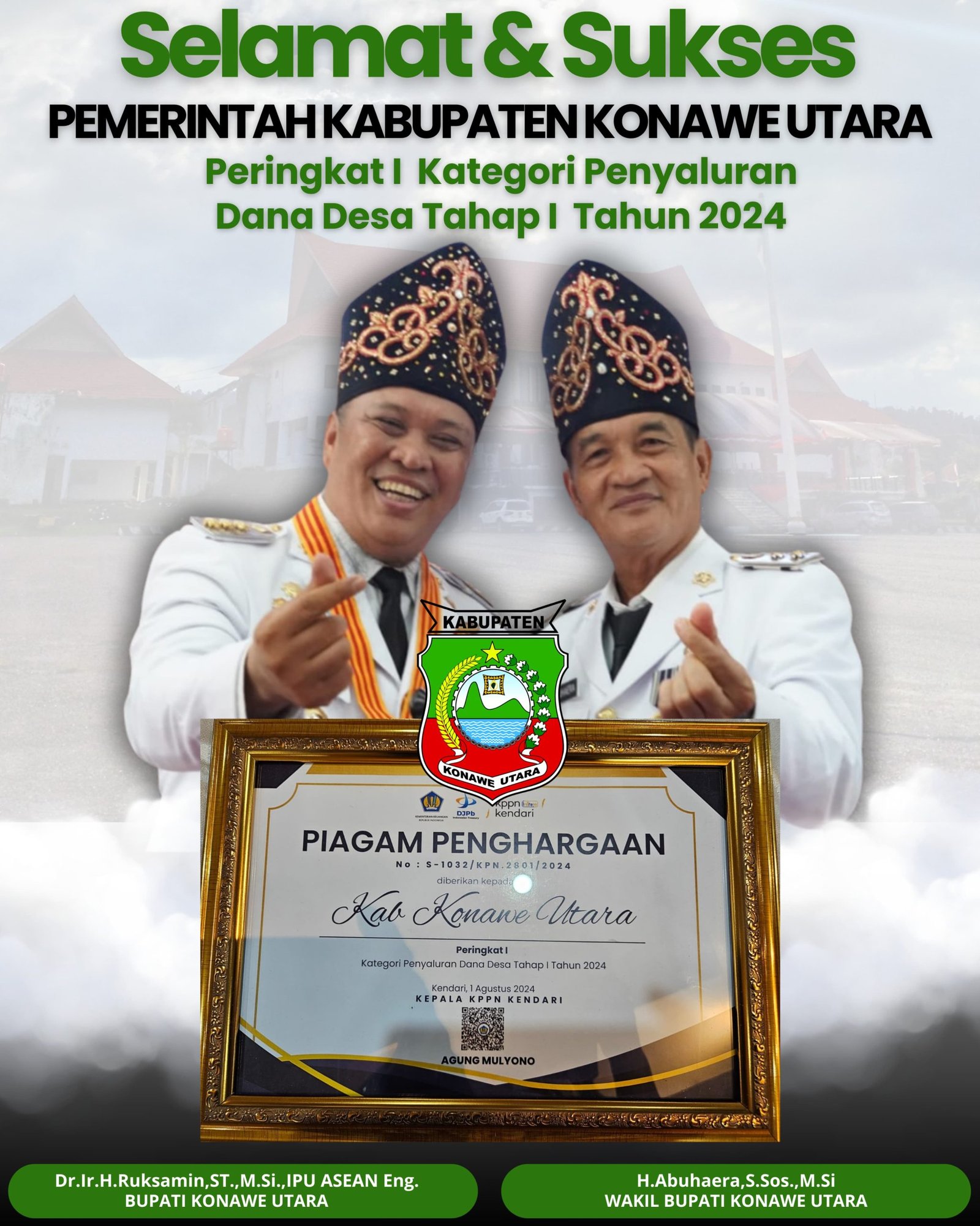 Globaldrafnusantara.Com konut Pemerintah Daerah Kab. Konawe Utara hari ini Selasa (06/08/2024) diumumkan sebagai juara pertama dalam kategori Penyaluran Dana Desa Tahap 1 Tahun 2024. Prestasi ini diumumkan oleh Kementerian Keuangan yang memberikan apresiasi terhadap kinerja pemerintah daerah dalam mengelola dan menyalurkan dana desa secara efektif dan tepat waktu.