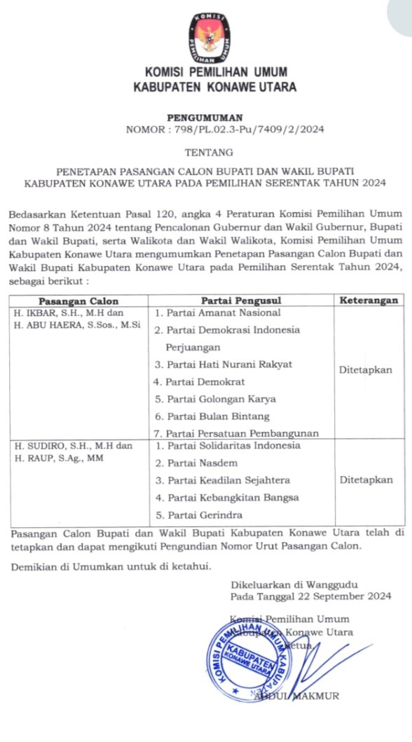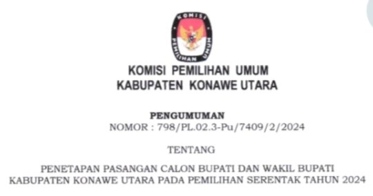 KPU Konut Resmi Umumkan Dan Menetapkan Pasangan Calon Bupati Dan Wakil Bupati Konawe Utara Pada Pemilihan 2024.Admin Redaksi22 September 2024Iklan & Baner10229 views Berita TerkaitJangan Lewatkan