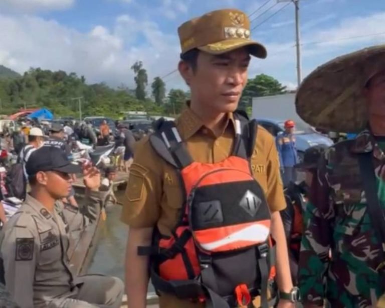 Setelah berdialog Bupati Konut Ikbar menggunakan rakit pincara untuk memeriksa langsung ketinggian air serta memastikan jalan transportasi darurat tersebut berjalan lancar.